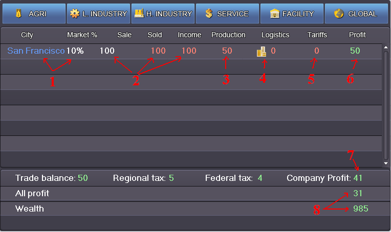 5- For this step let’s use an example. Say we have an agricultural company called “MY AGRI” in San Francisco, and want to take over the local market—and that we are the only player based in SF now. How the Agricultural Sector works is related to the number of real players on the map. One real player (or, a player’s HQ) gives the city 1 Industry Capacity in the Agricultural Sector. So in my case the HQ I’ve built in SF increases the local agricultural industry capacity to one. Each one industry capacity provides businessmen to sell one thousand market units within it (1 industry capacity is equal to 1000 market units).
