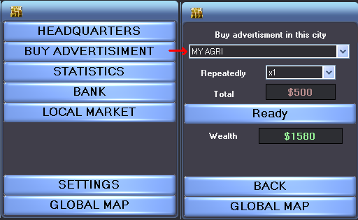 6- Now we want to sell our market units—and this requires that we be a known company on the market. To accomplish this, we should launch our first advertising campaign. Let’s click the button “BUY ADVERTISEMENT” and buy one-time advertising in the city.