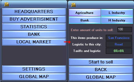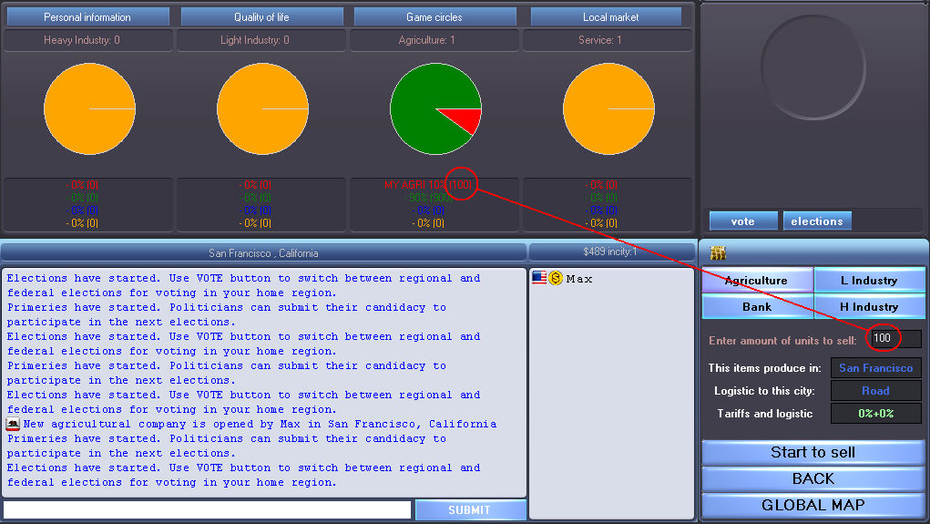 9- Now that our company has grown, it’s time to sell our market units and get some profits. Let’s open a new menu with the button “LOCAL MARKET”, choose our market sector (Agriculture), and enter the amount of market units we would like to sell (100). Then click “Start to sell.”