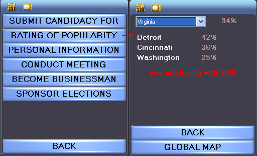 5- During elections your main task is to raise your Popularity score (measured as a percentage) so that it surpasses your opponent’s within each political game circle. Each city will have its own popularity rating for your individual candidates automatically, but you can use advertising to improve it. One advertising campaign will boost your popularity by 5% in the chosen city. However, be aware that the price of advertising is generally determined by the number of HQs (corresponding with the number of residents) in a given city. For example, if a city has three separate HQs, the one-time advertising campaign would cost $600 (HQ of 3 * $200/per ad campaign).